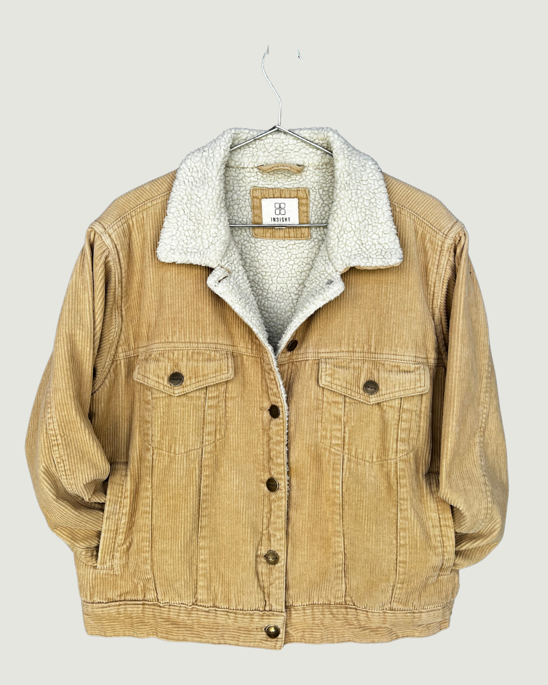 Collared corduroy trucker jacket with teddy lining for extra warmth. Button up with front pockets.