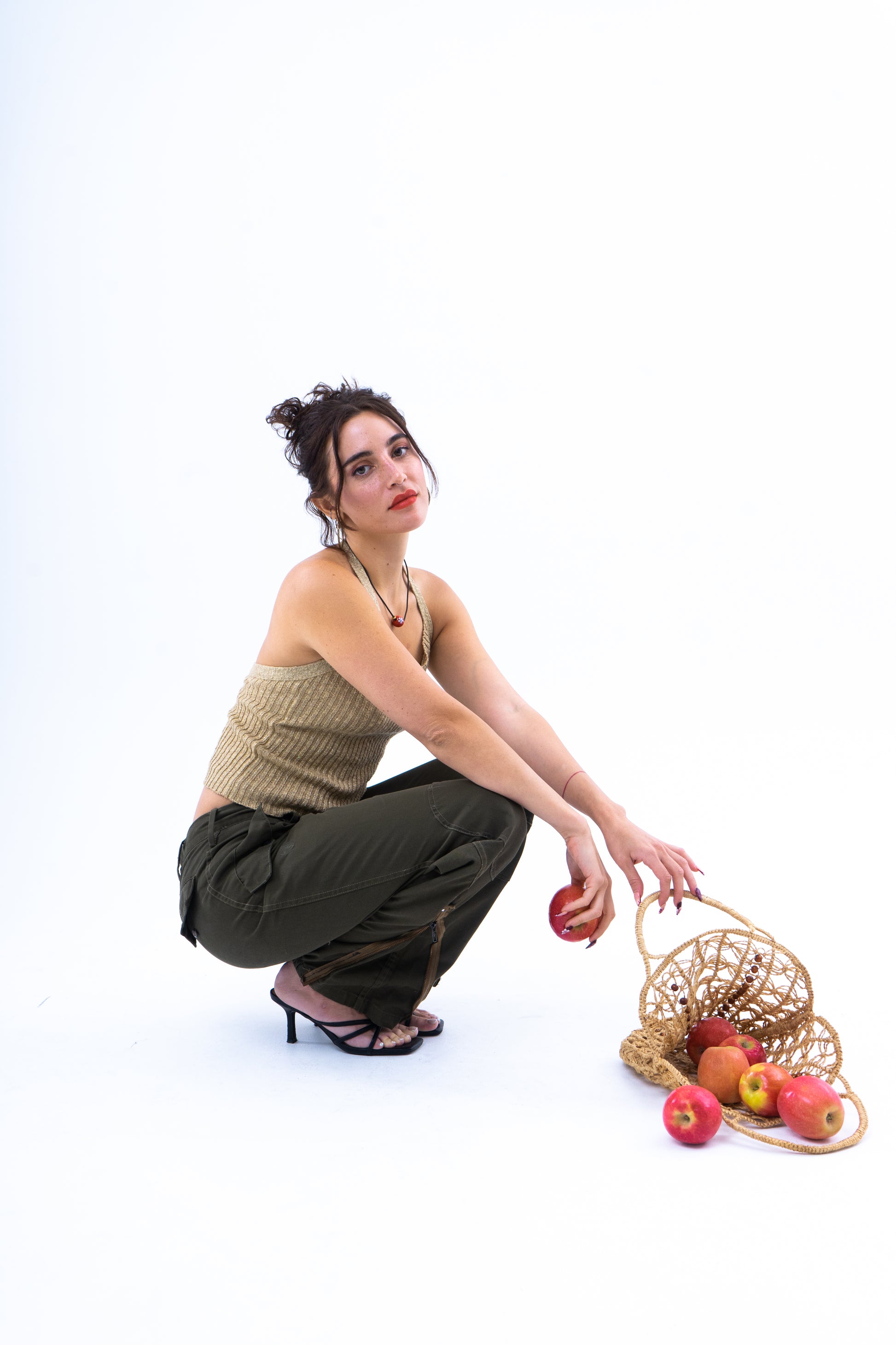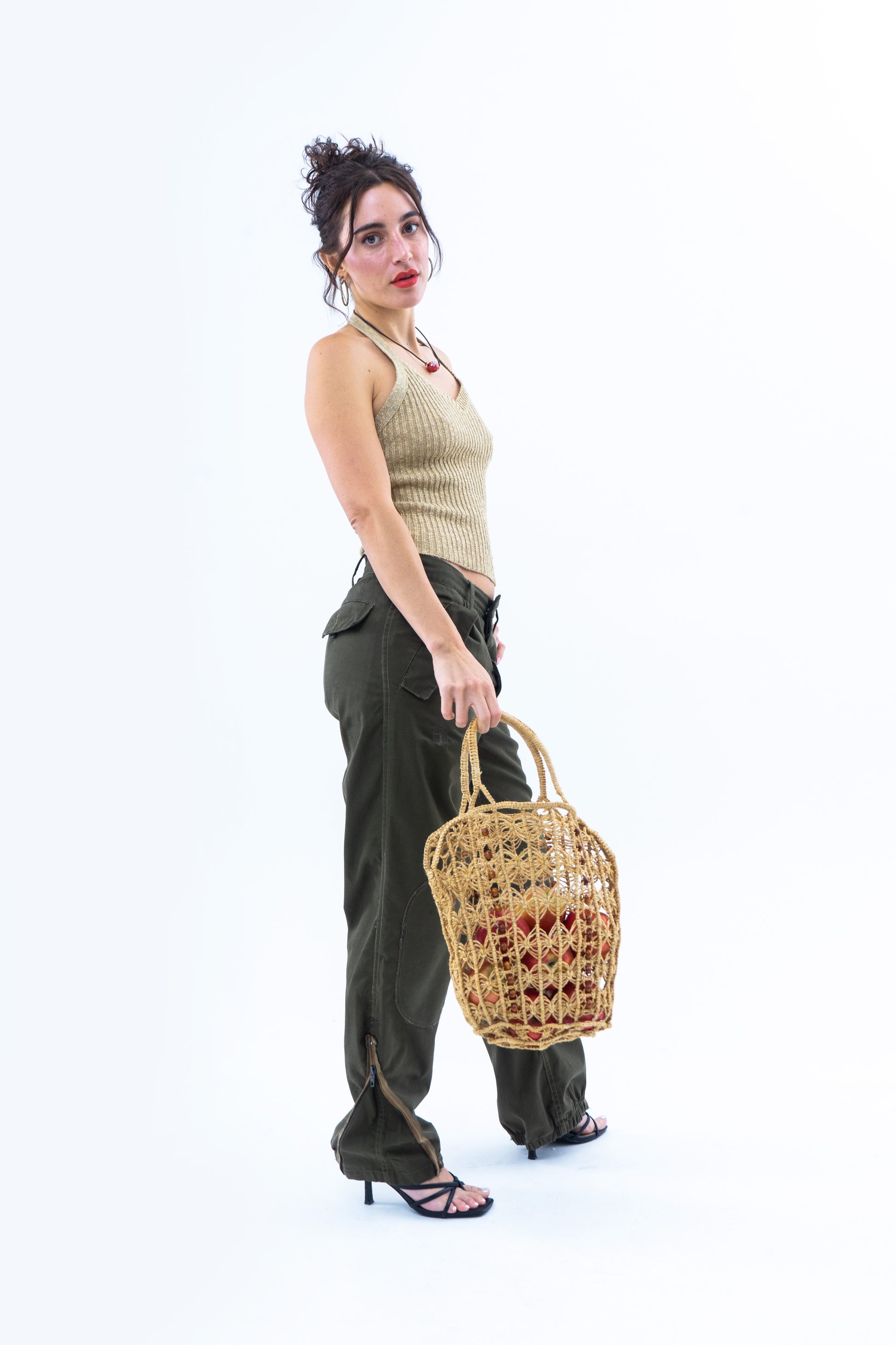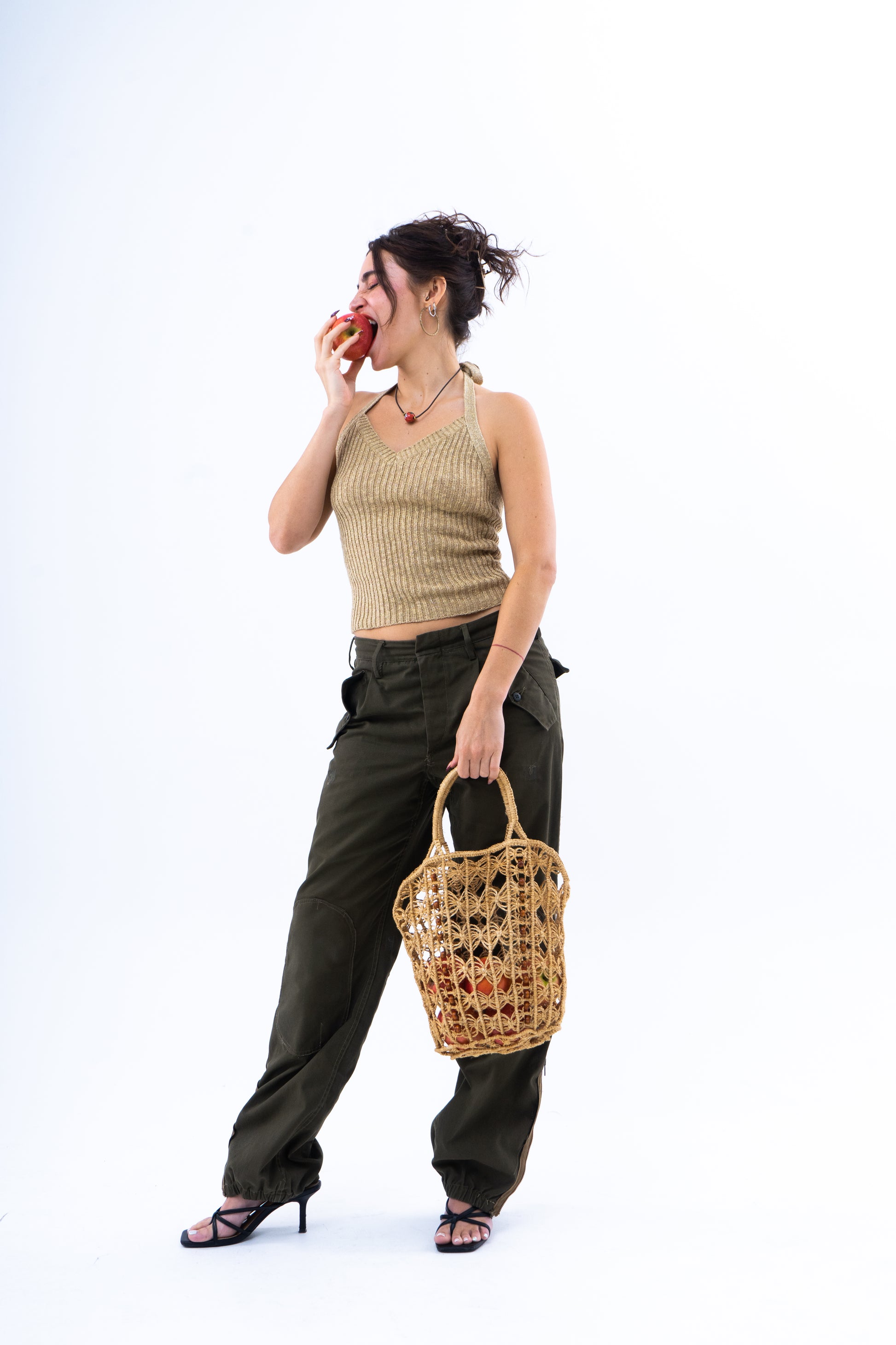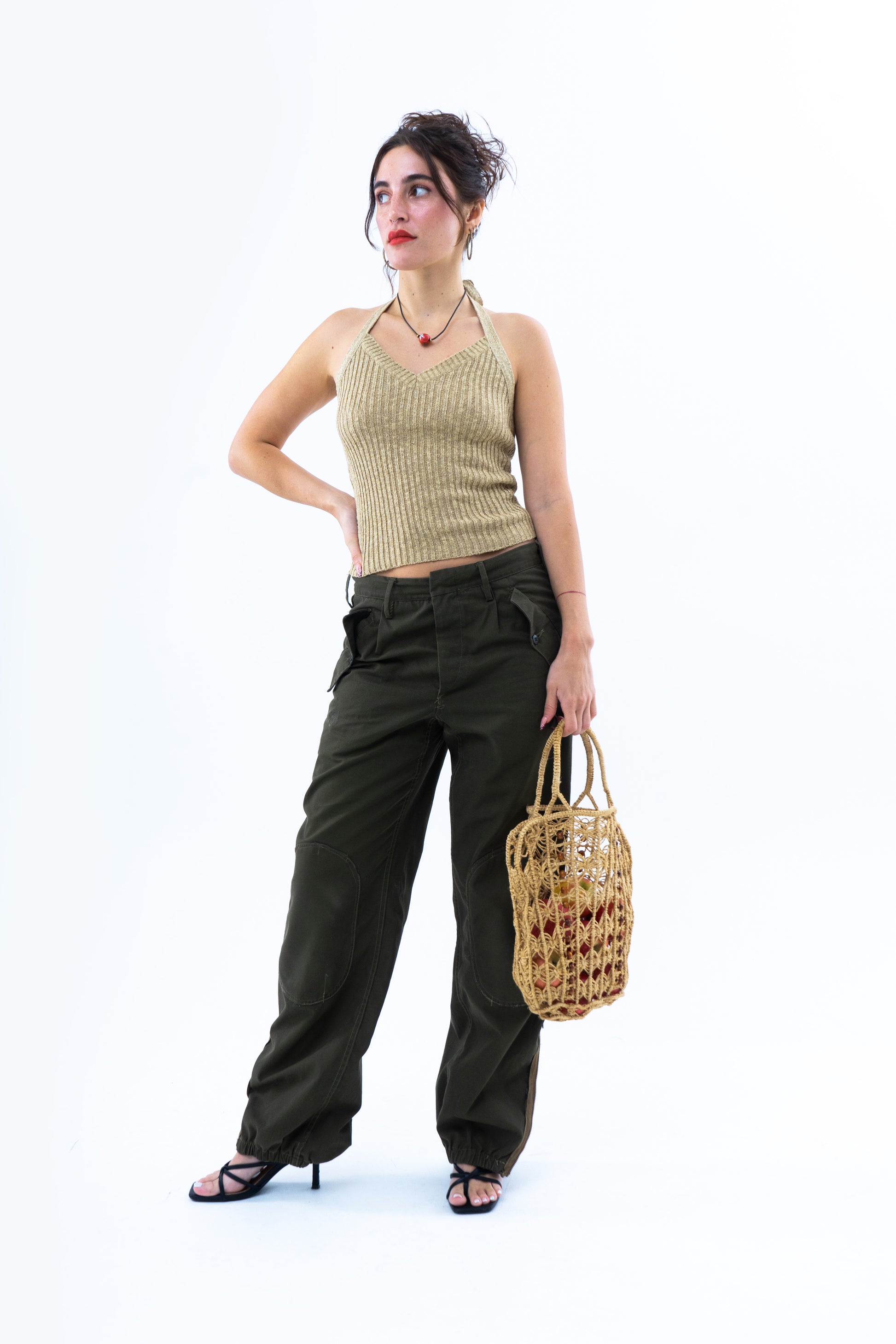 Glittery-gold fully stretchy and adjustable halter top. Best fits size small.