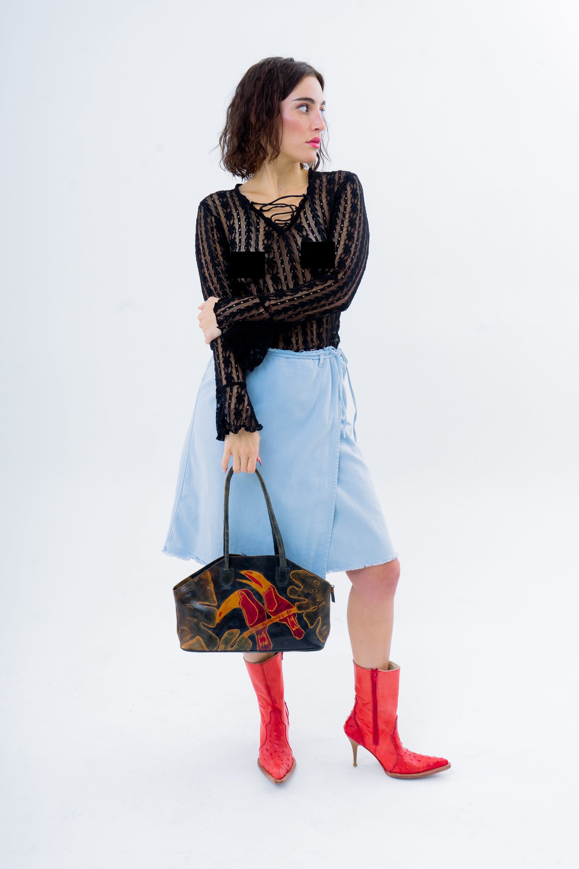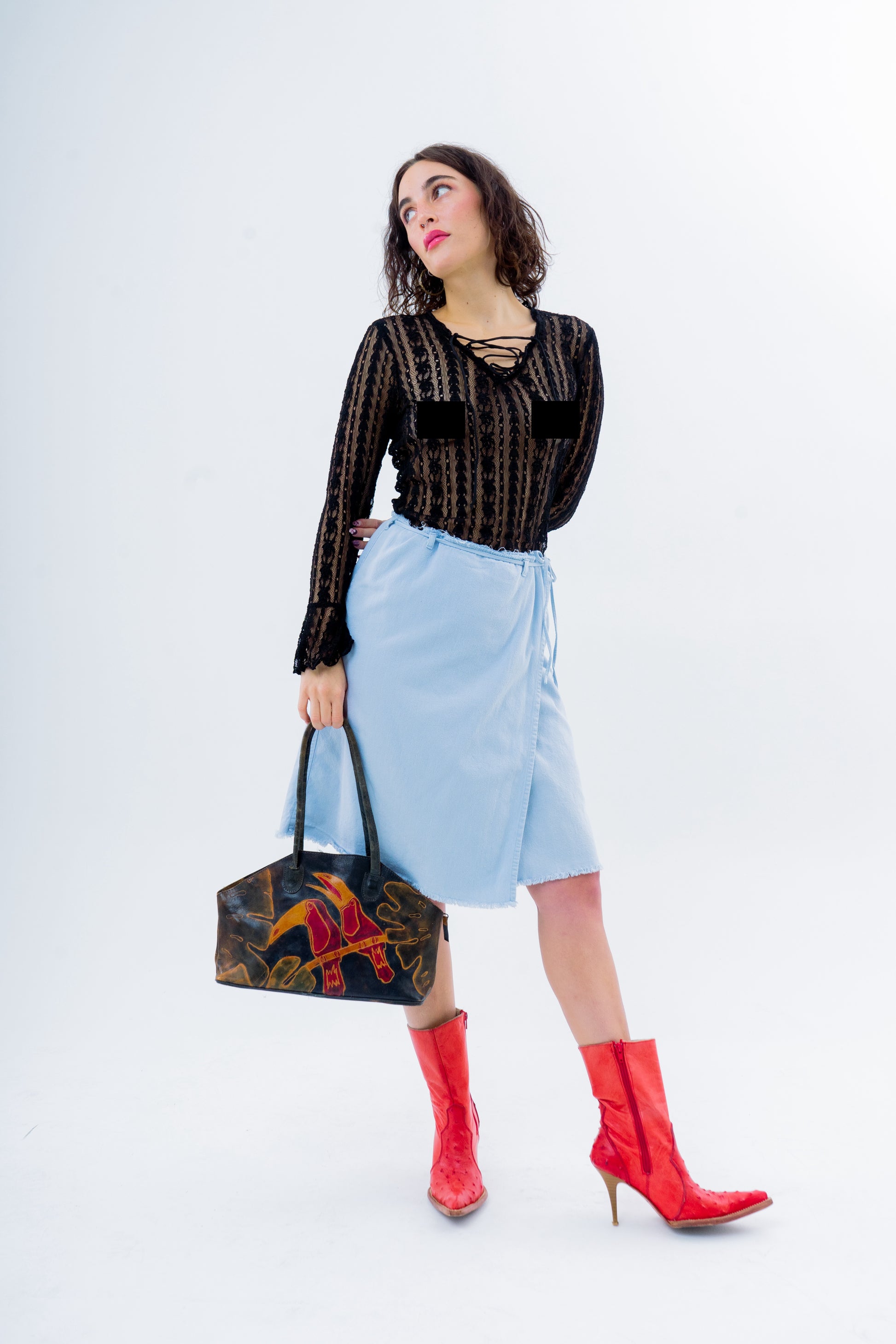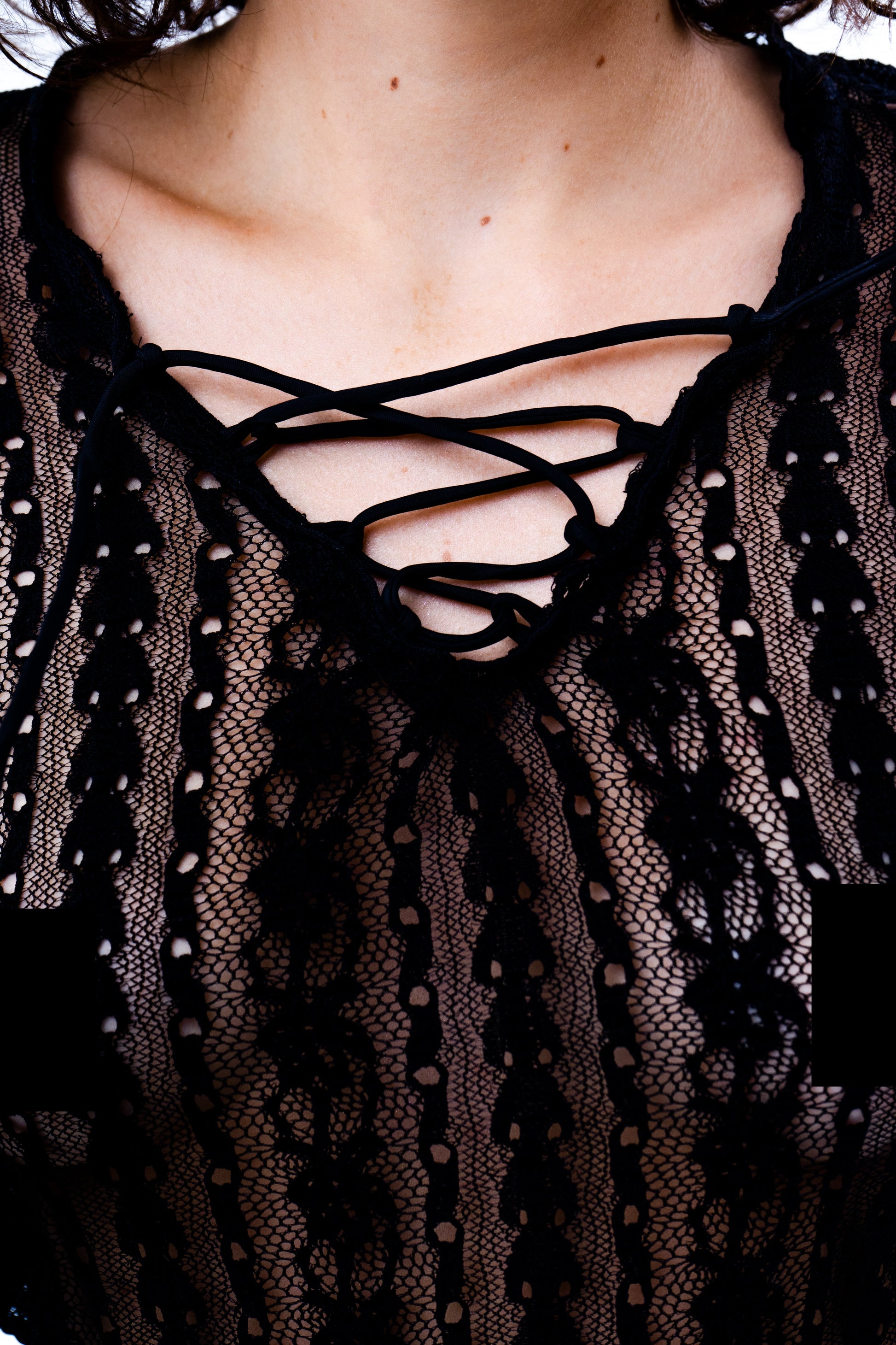 Vintage from Guess Jeans. See-trough lace top, bell sleeve, v-neckline laces up. Best first size large.