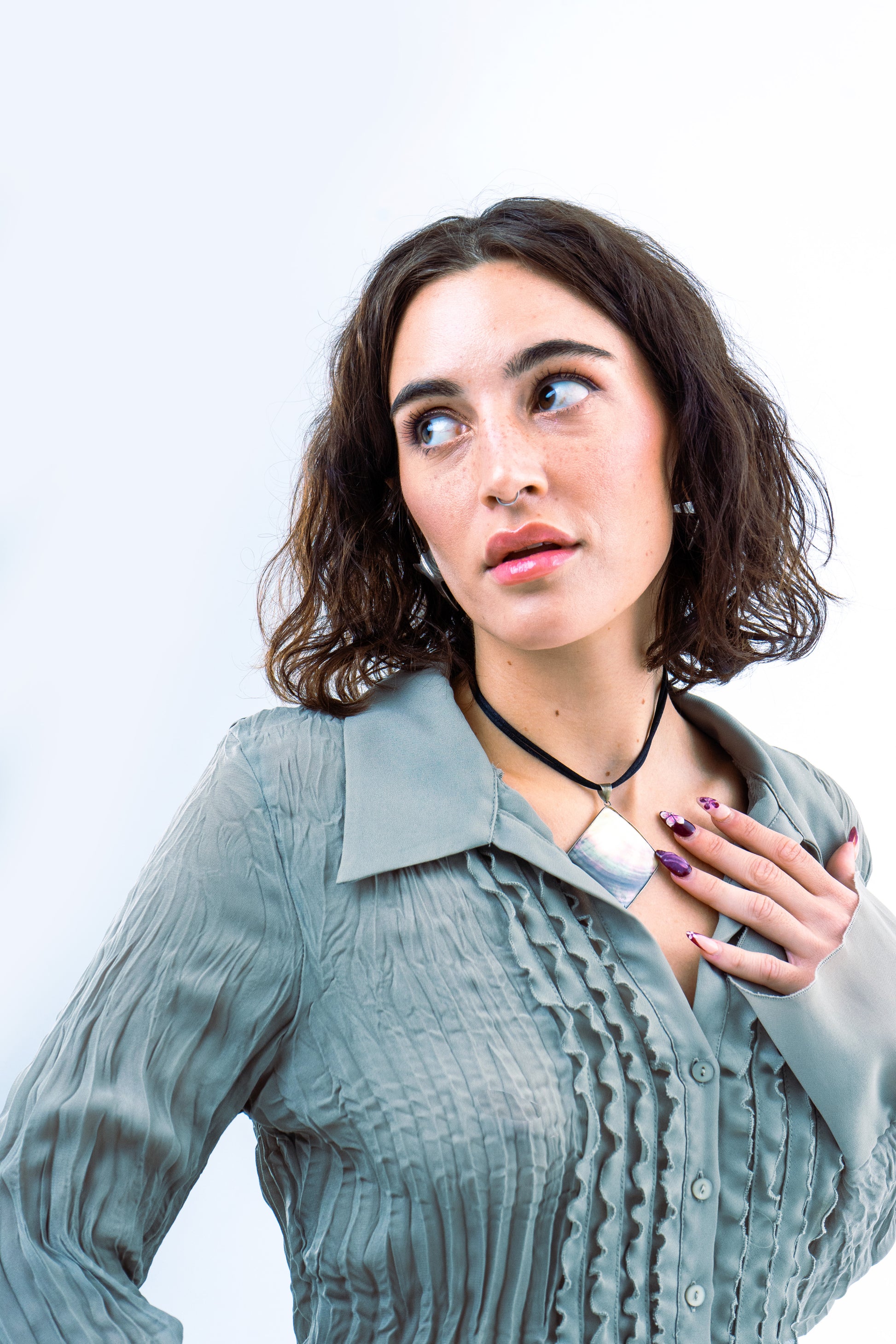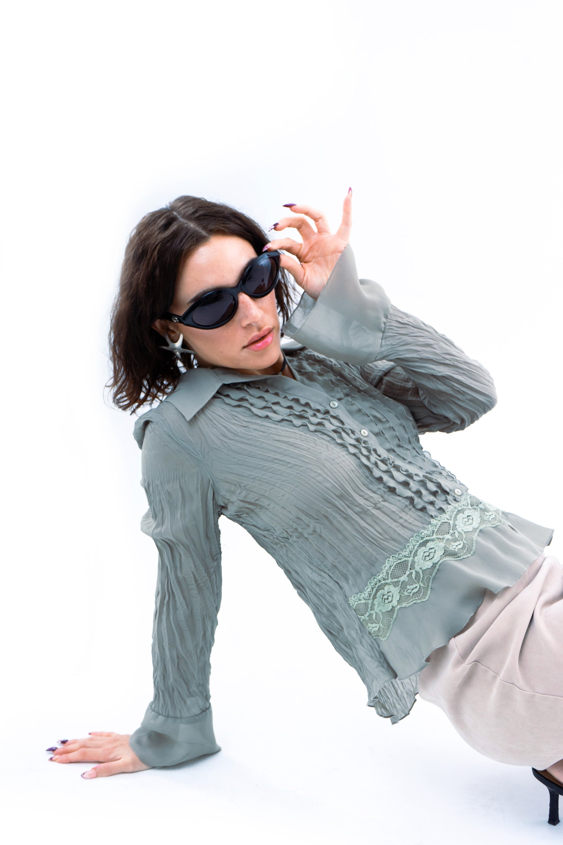 Sage green ruffle and crinkled blouse. Peplum shape with floral details. Best fits size large.