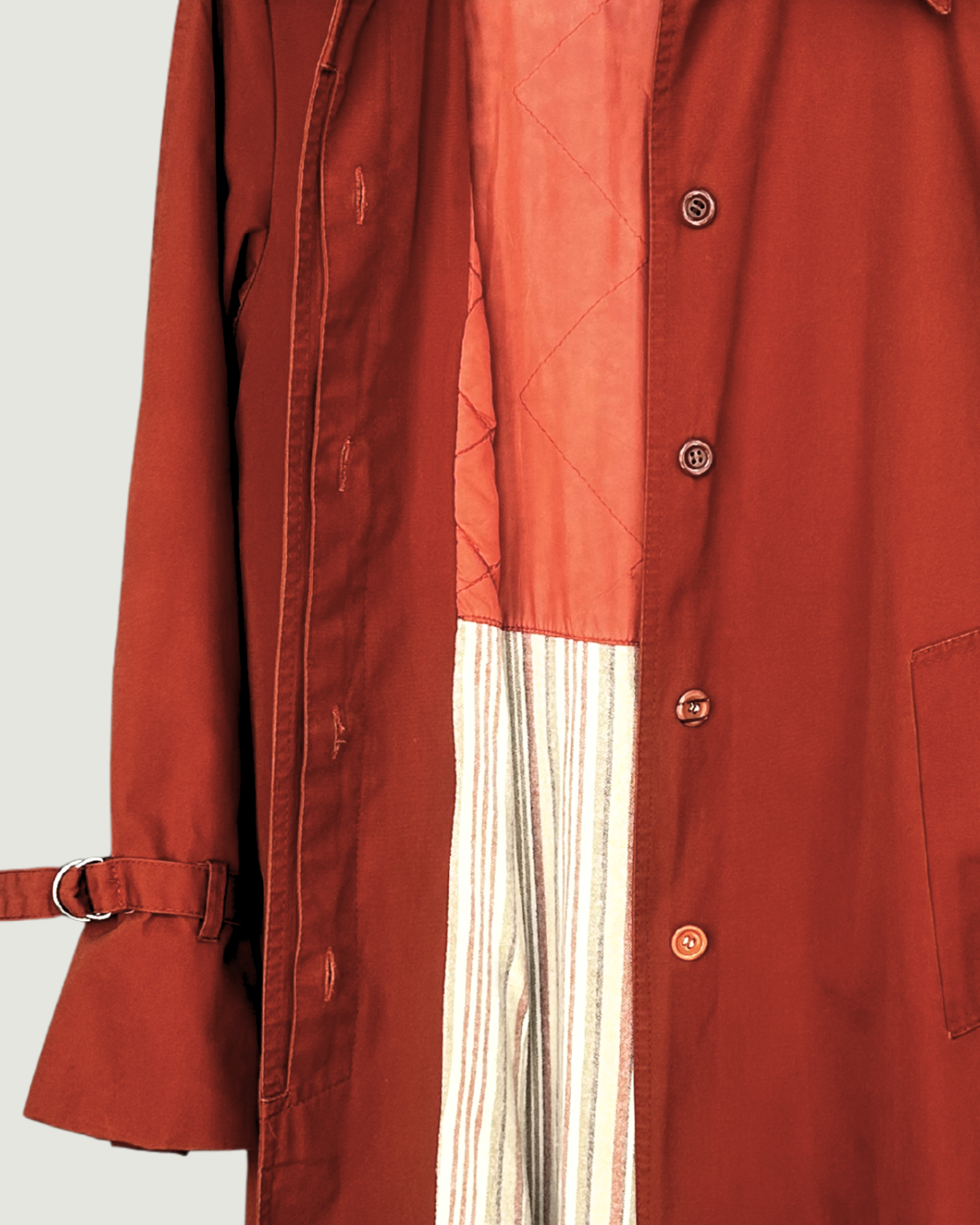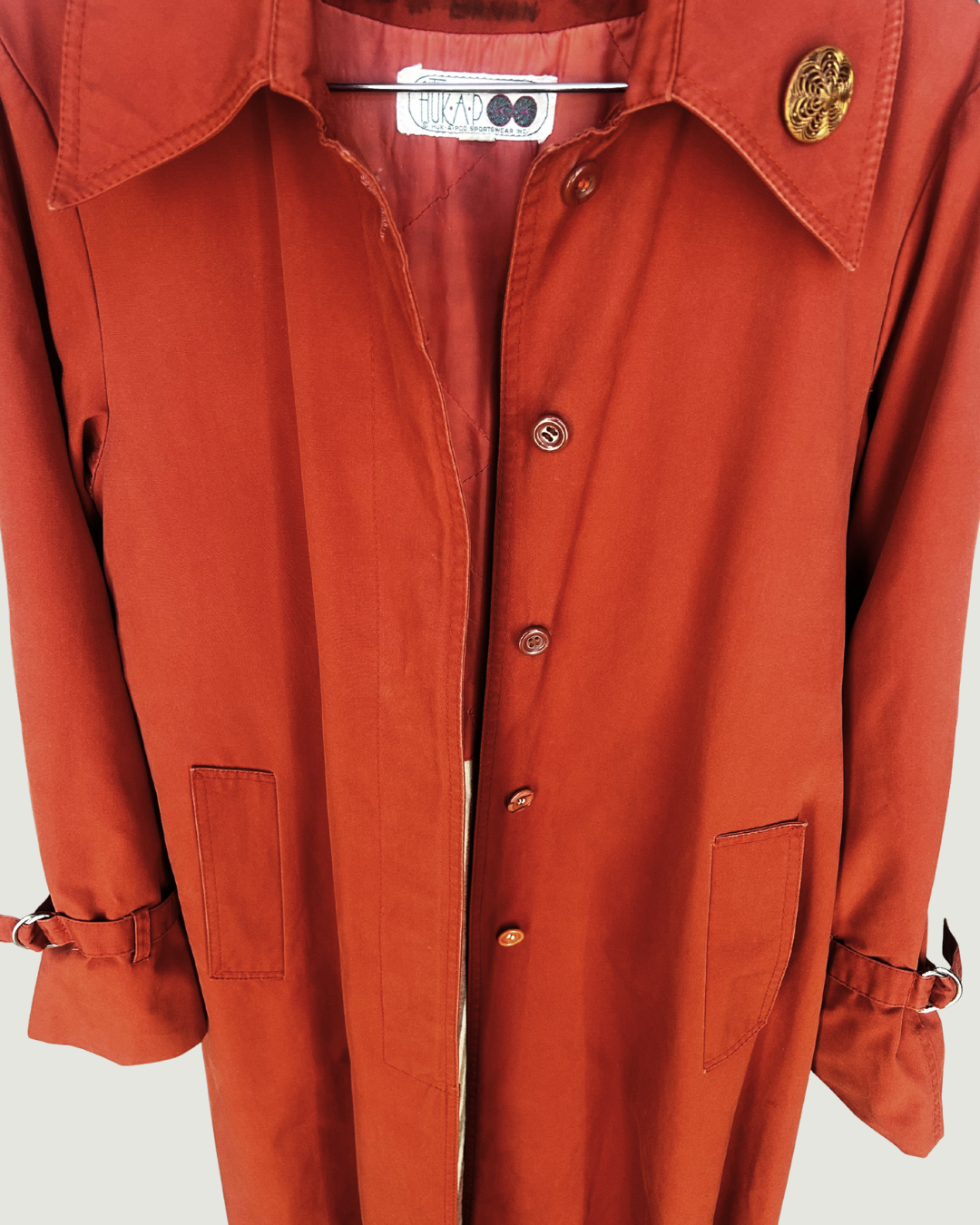 Terracotta colored trench, single breasted with collar, gold pin is sewed into the collar. Ankle length and adjustable at waist. Quilted lining for extra warmth.