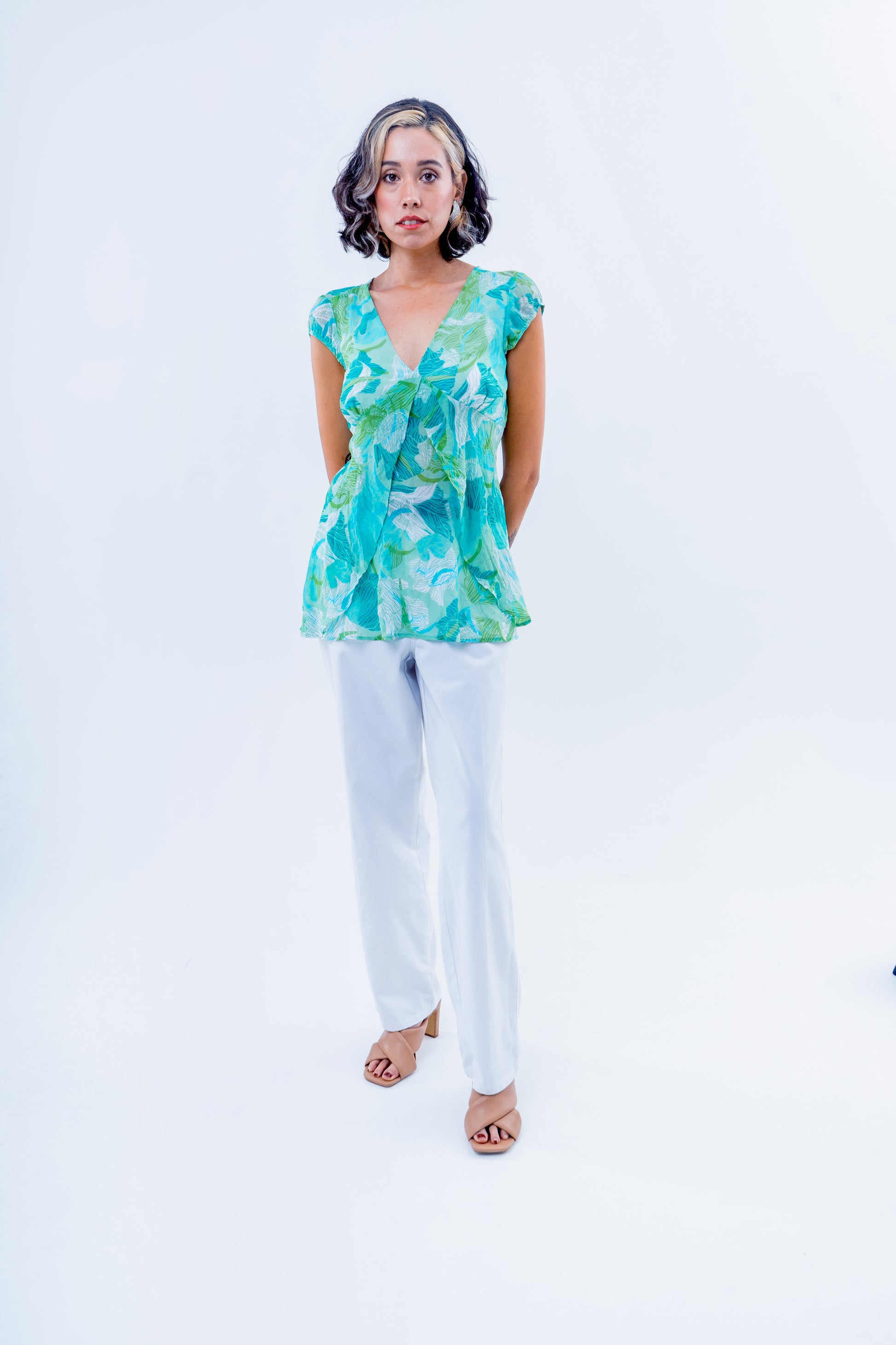 Flowy top with cap sleeve and v-neck. Completes a tropical look. Best fits size Medium.